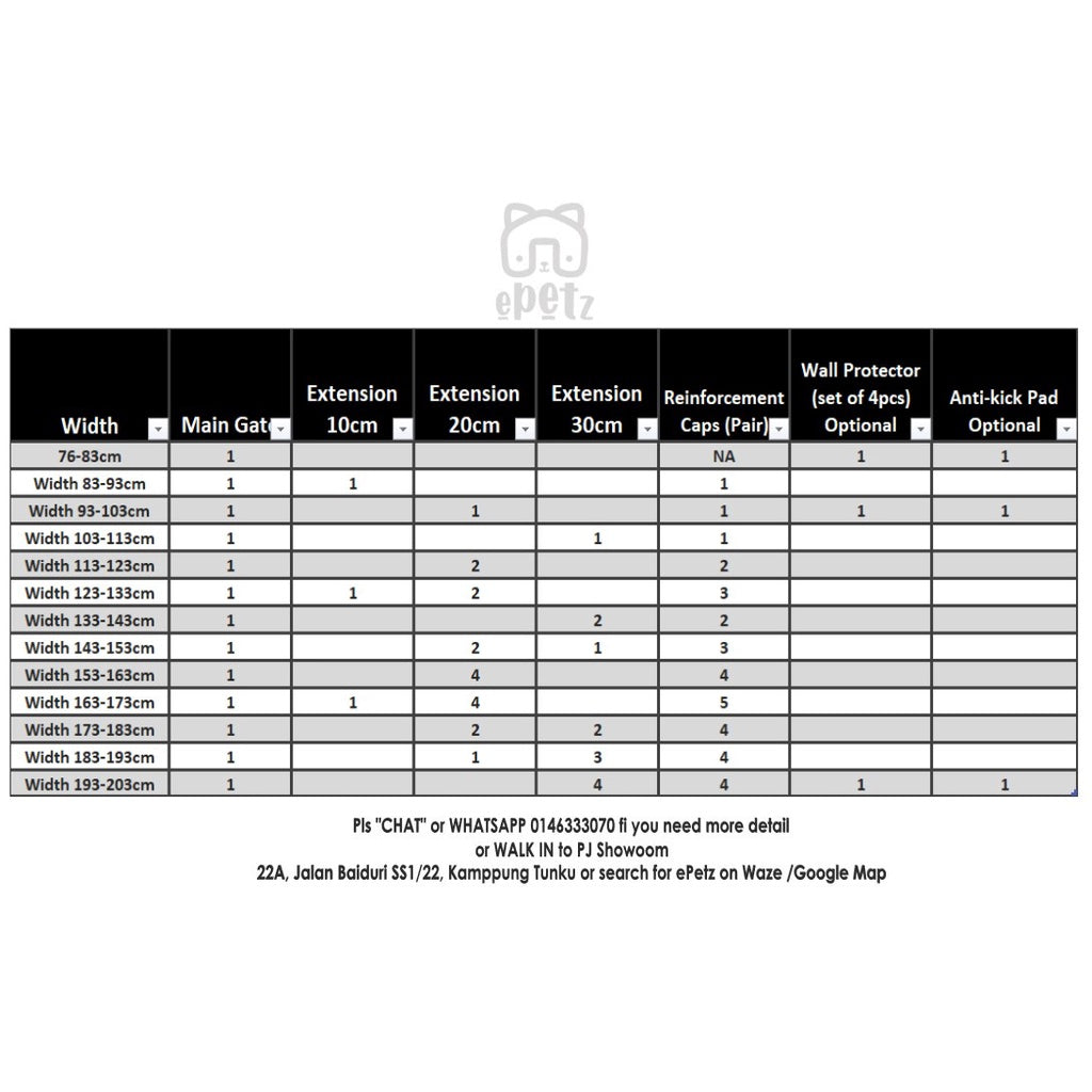Size Chart & Add-on Accessories For Pet Safety Gate